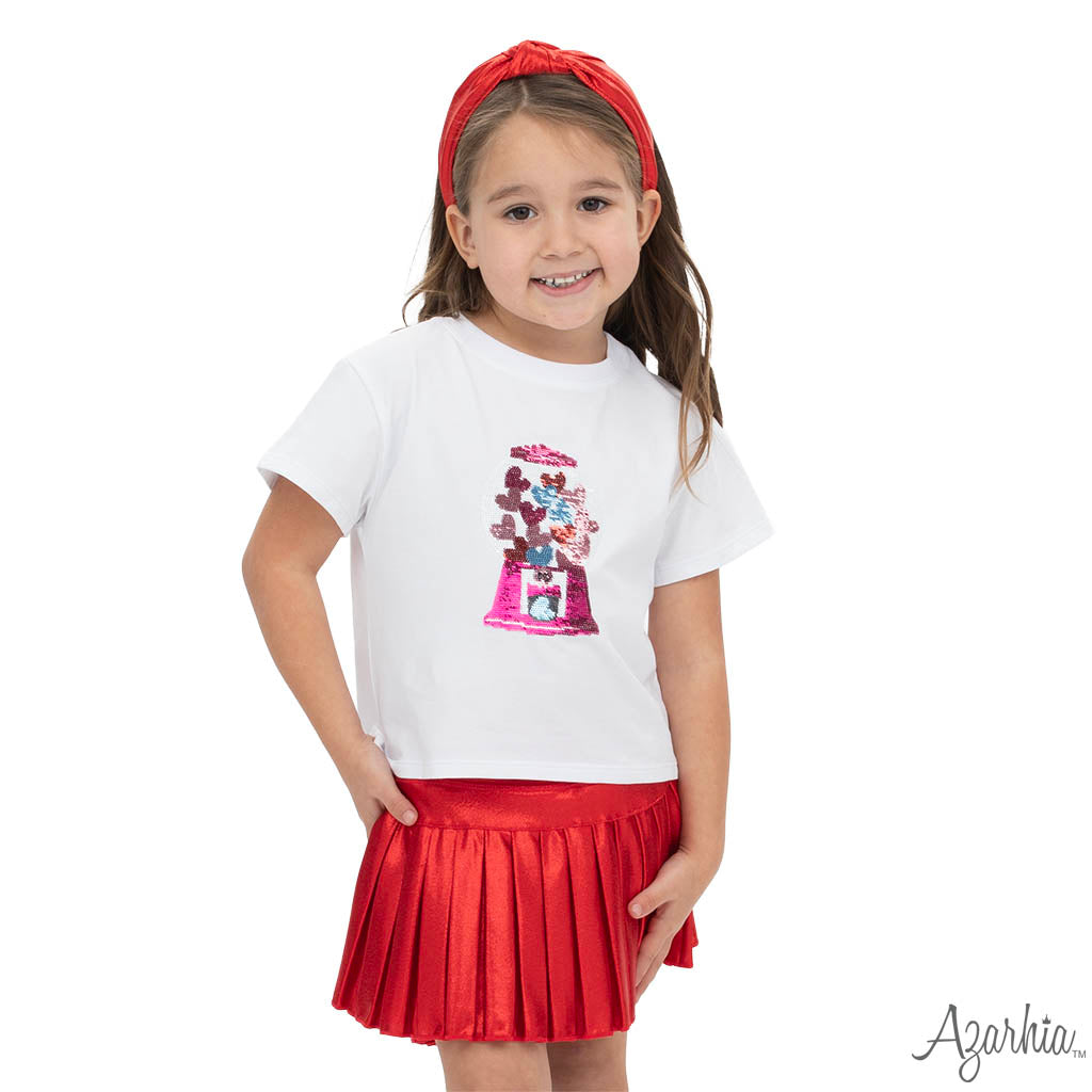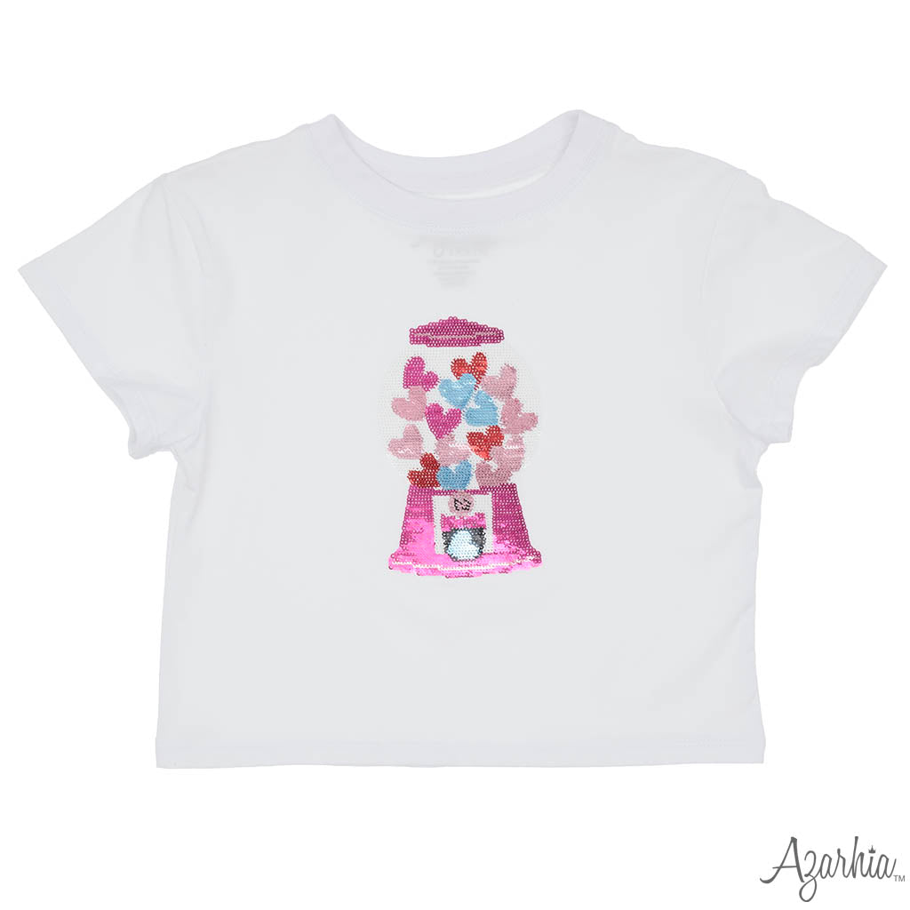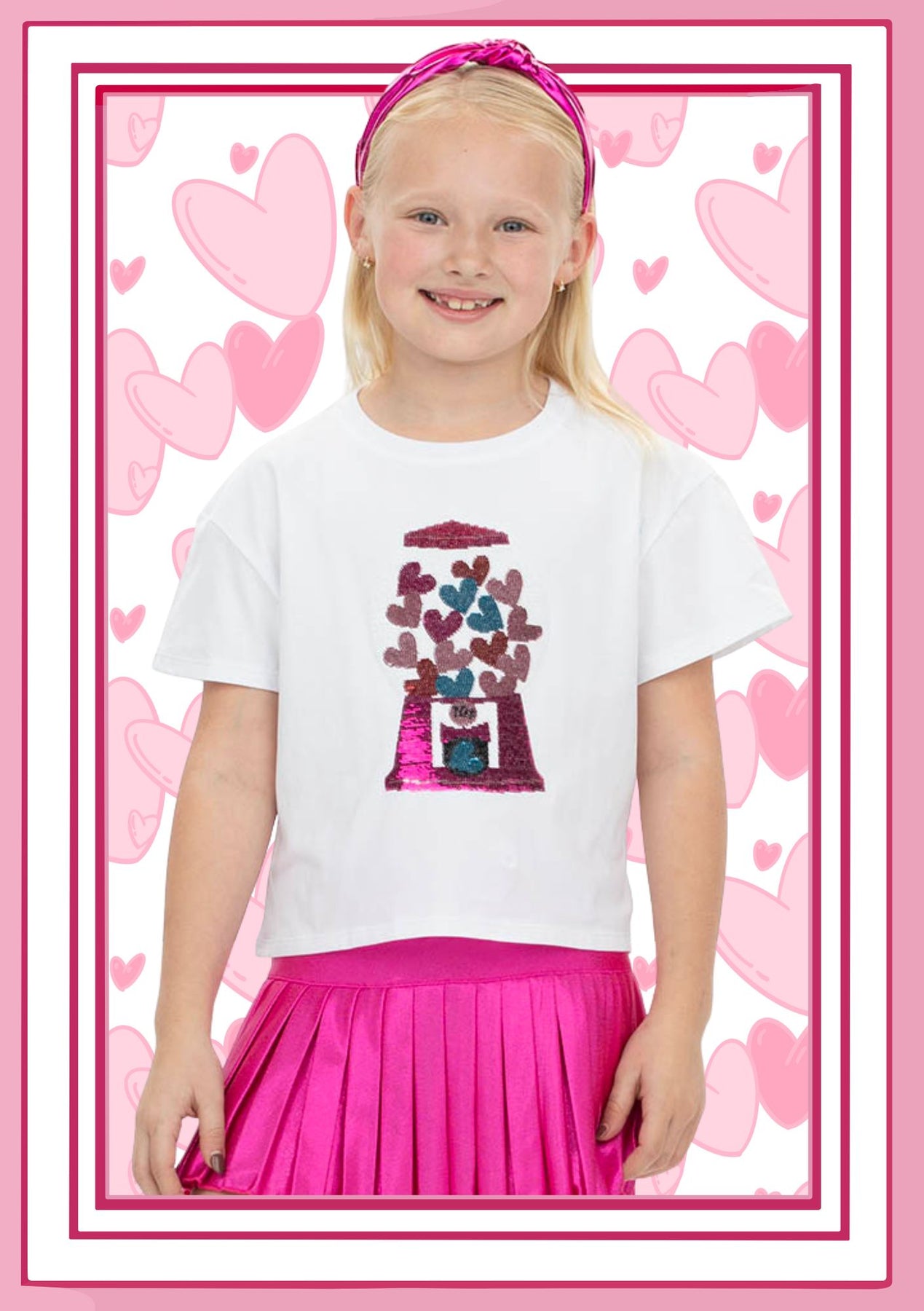 Playful white boxy tee featuring eye-catching sequin gumball heart details.